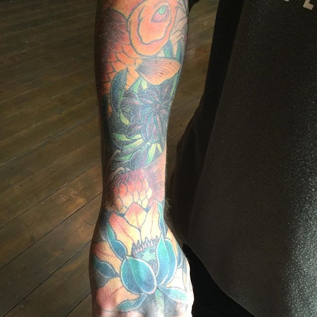 torbaytattootales Many thanks to Matt for sharing his story with us today...”I tattooed this on myself during my apprenticeship years at the start of my tattooing career, I used the Koi swimming upwards to represent the start of my career, knowing it would be hart work but I have determination to make it. (The Koi swims up the river against the current).”