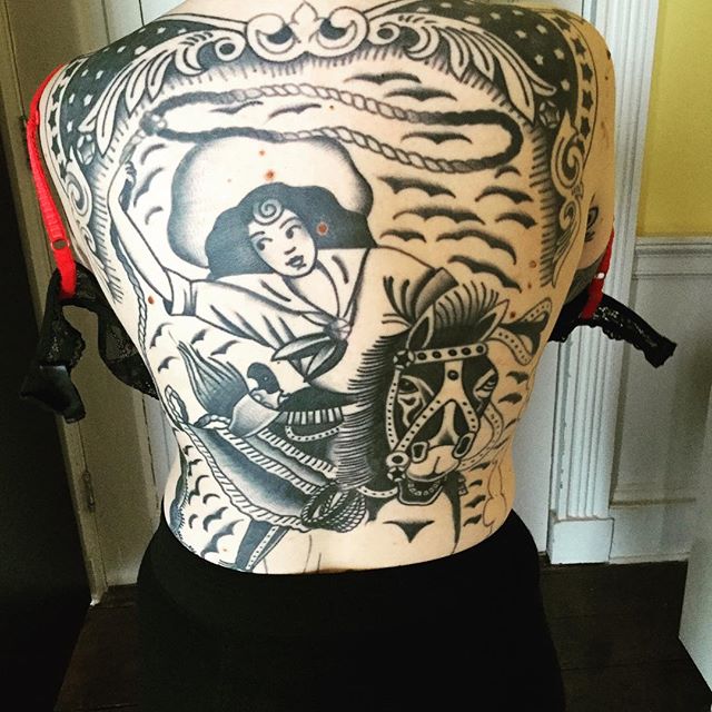 “My backpiece was tattooed by Sway at Sacred Electric in Leeds. The design is a tribute to the original Annie Oakley backpiece by Ben Corday.